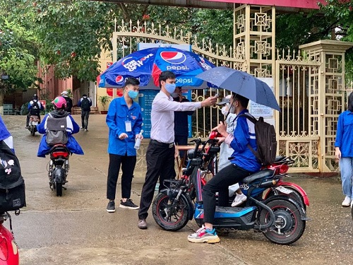 Trong những ngày đầu tiên trở lại học tập, dù điều kiện thời tiết không thuận lợi, Đoàn thanh niên phối hợp với Ban quản sinh nhà trường vẫn thực hiện nghiêm các quy định trong công tác phòng, chống dịch theo đúng chỉ đạo của lãnh đạo Sở và lãnh đạo trường: